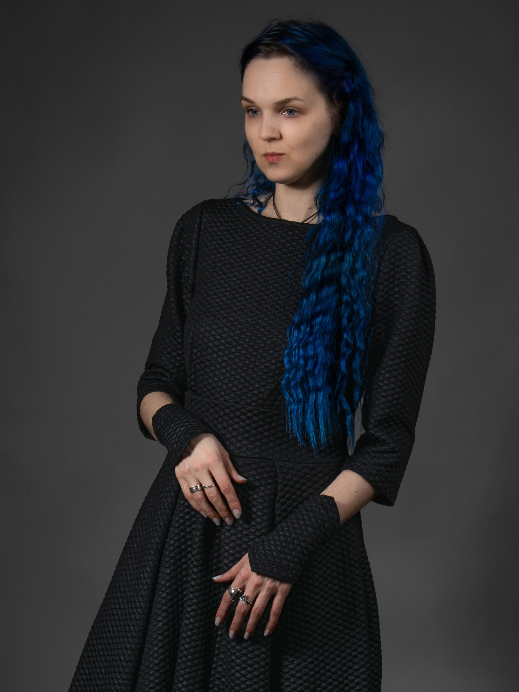 Pointy armbands made of textured polyester jersey. The fabric is stretchy so it's not a problem to get them on or take them off if the right size is chosen. Often chosen for LARP and Cosplay as it reminds snake skin.