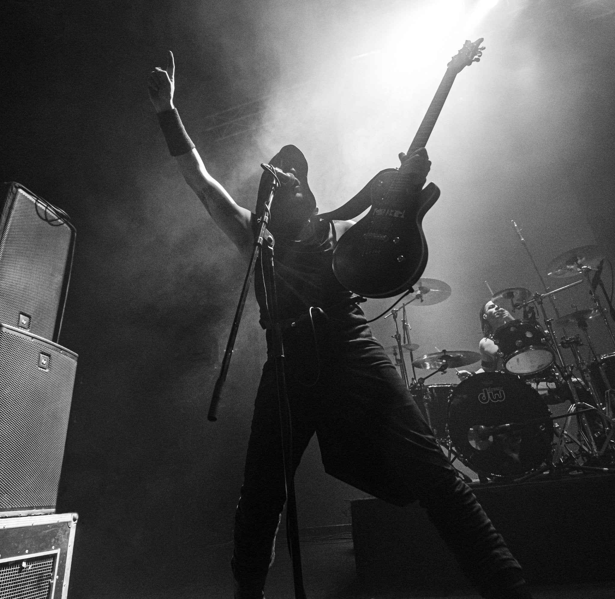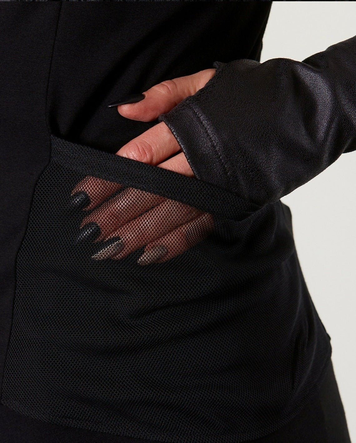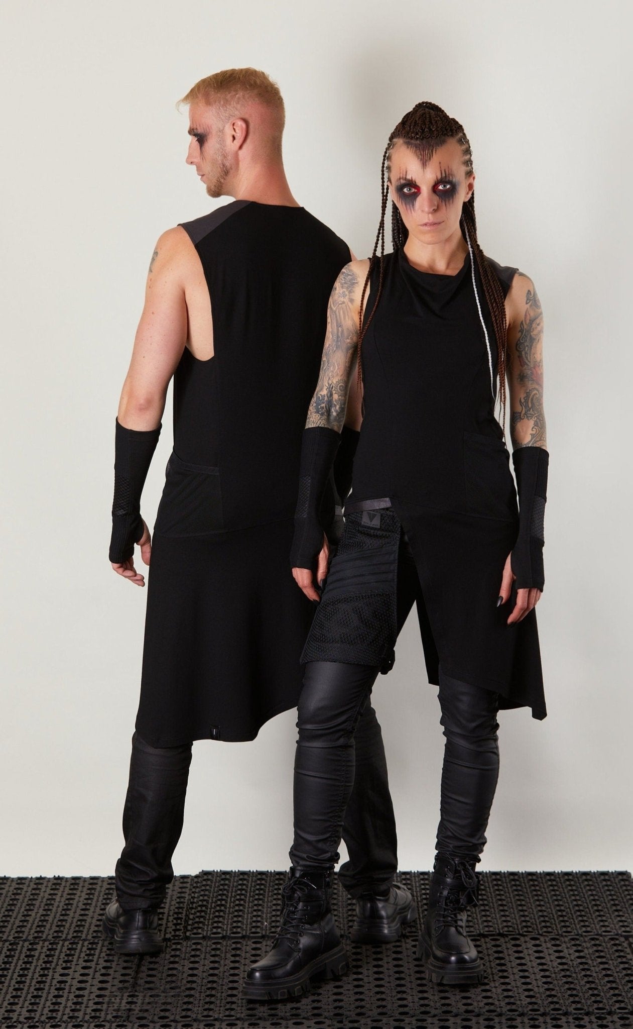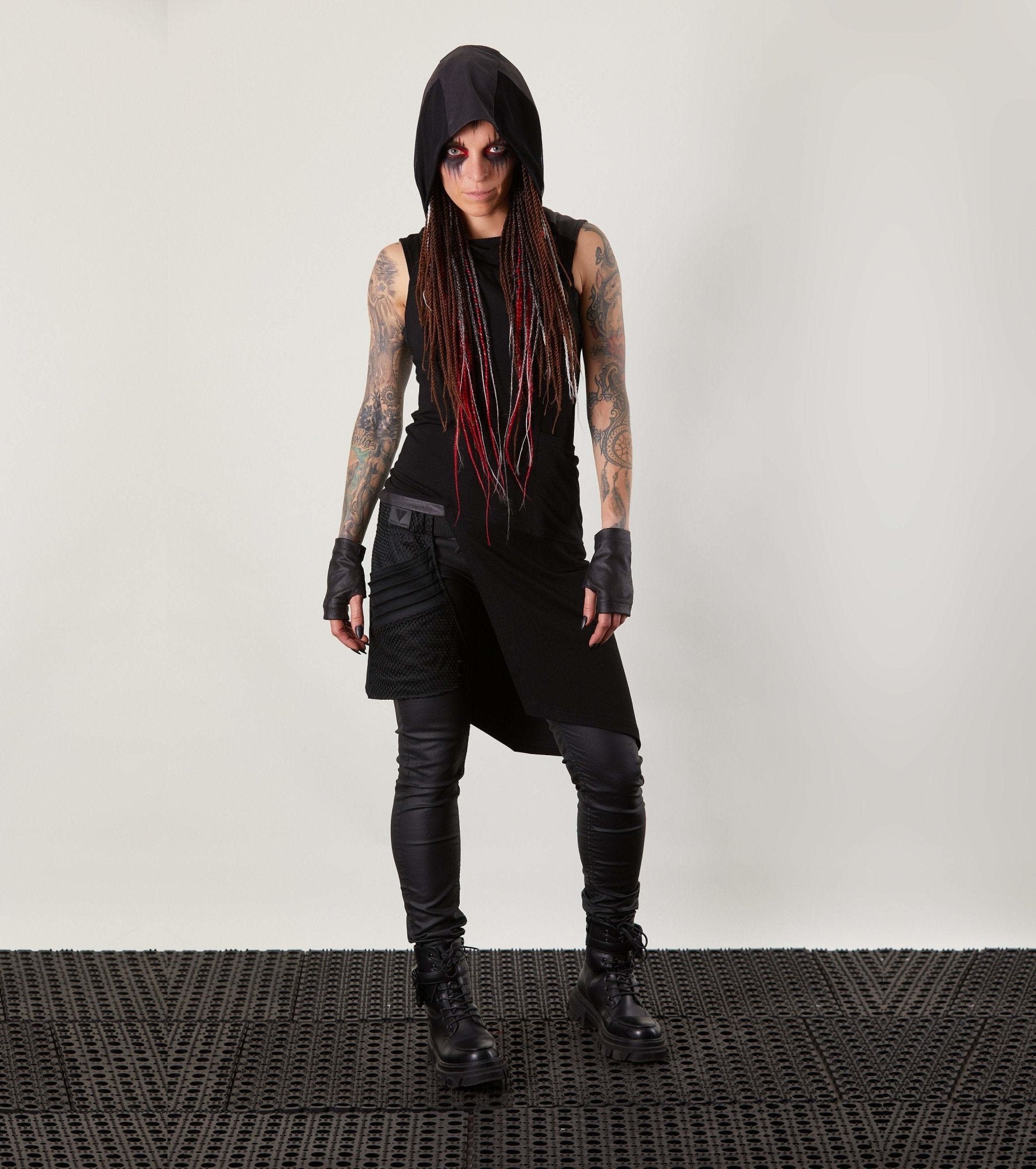 Asymmetric sleeveless shirt made in black viscose jersey and faux leather. This outfit is a simplified version of Eric13 dream stage outfit that we designed together. Made of light breathable fabrics so it wouldn't be too hot on stage. We designed asymmetrical bottom so it was possible to hang equipment on the belt on one side while still having some flare on the other side. Armholes are reinforced so they wouldn't lose shape. It is easy to care on the road during the tour. The garment is sewn with Eloflex thread which minimizes the risk of seam breakdown on stretch fabrics.