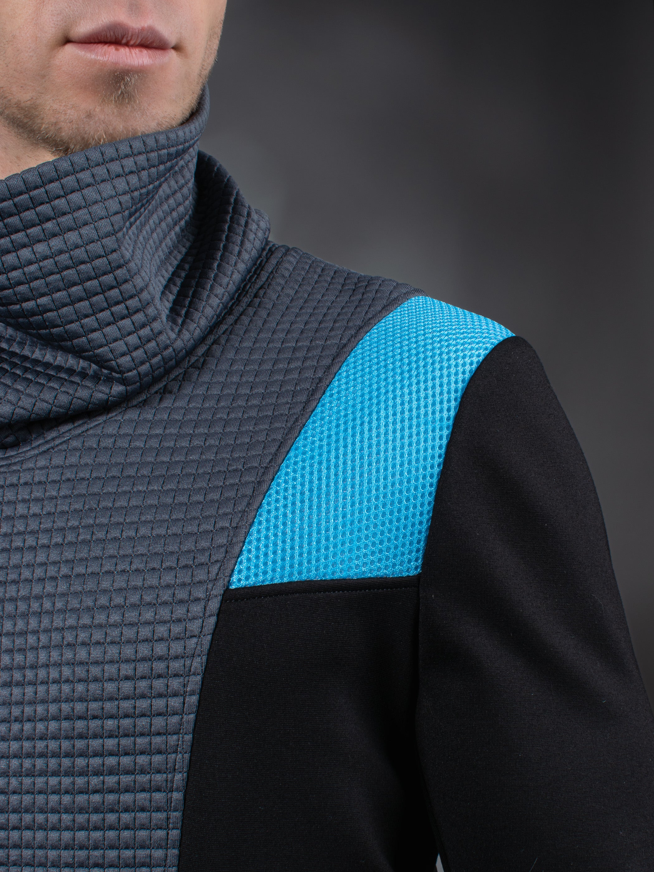 Gray cyberpunk sweater with thumbhole sleeves. The garment is made of breathable and soft viscose fabric combined with textured polyester fabrics ensuring comfort and a smooth feel against the skin. The fabric is stretchy, ensuring a flexible and comfortable fit. The Turtleneck collar is about 20 cm / ~8in high. You can pull it up for extra warmth or protection.