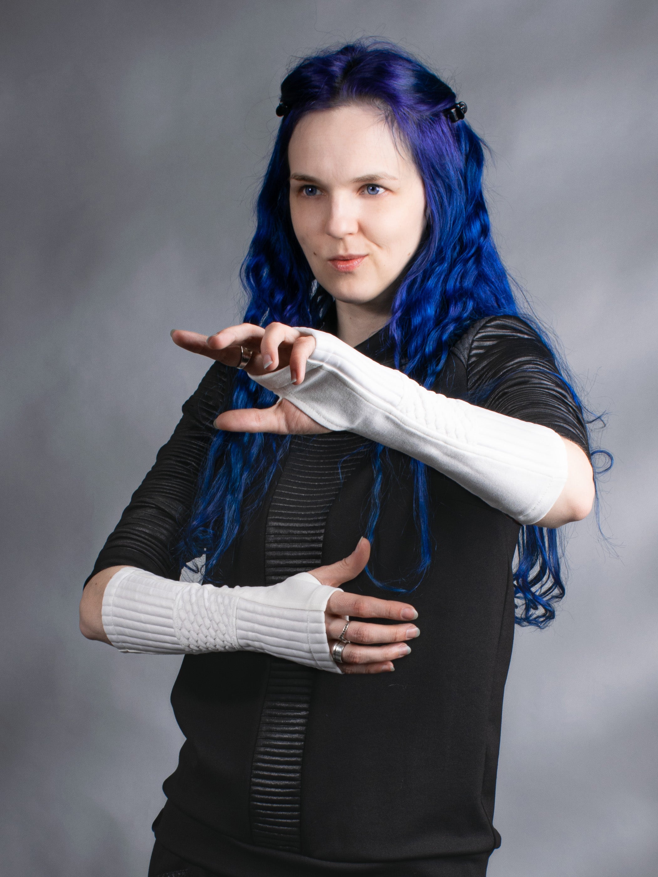 Cyberpunk arm warmers are made of stretchy geometric fabric. The gloves are made a little smaller than the hand so it would hug your hand in a comfy way. Gloves length - 30-31 CM/~12 1/4