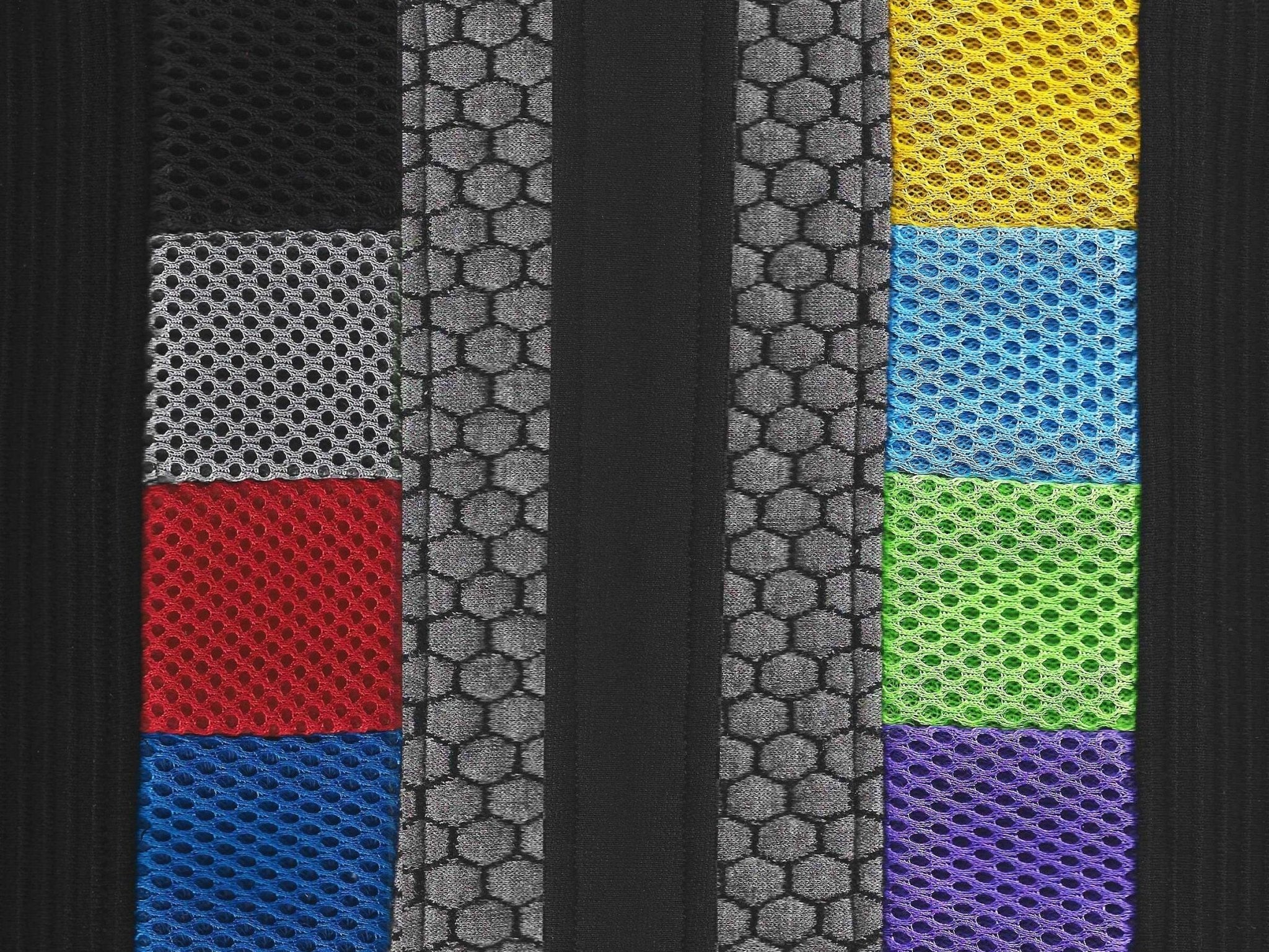 Men's cyberpunk sweater with gray shoulder parts and 3D mesh inserts, high collar, and thumbhole sleeves.