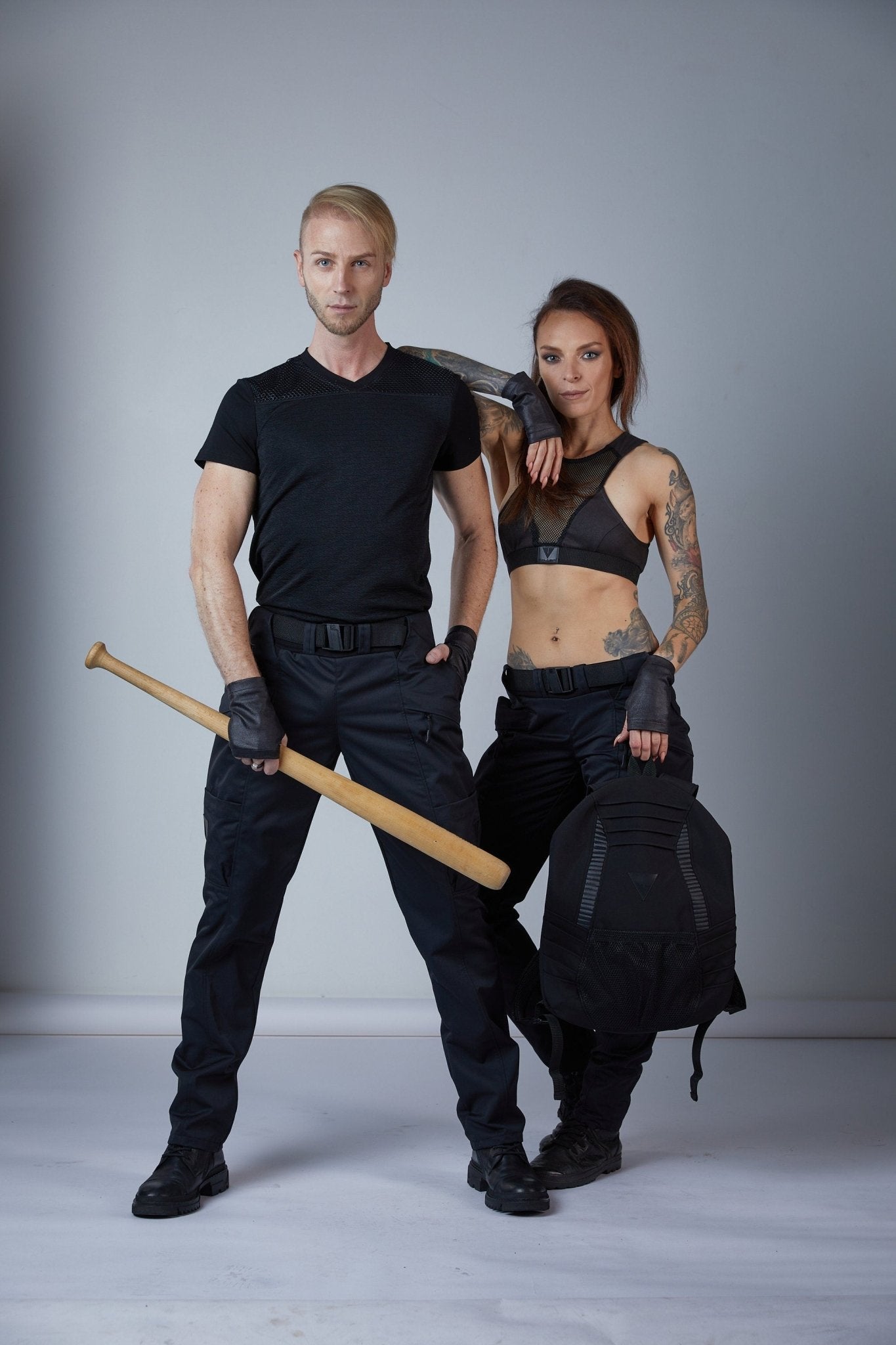 Black waterproof backpack made in cyberpunk, Sci-Fi style. The outer layer is high-density water repellent polyester. It provides resistance to rain or snow. It has a waterproof zipper on the back. Such closure placement makes it hard for a stranger to get inside your backpack without you noticing. The zipper is also convenient to use without taking off the backpack.