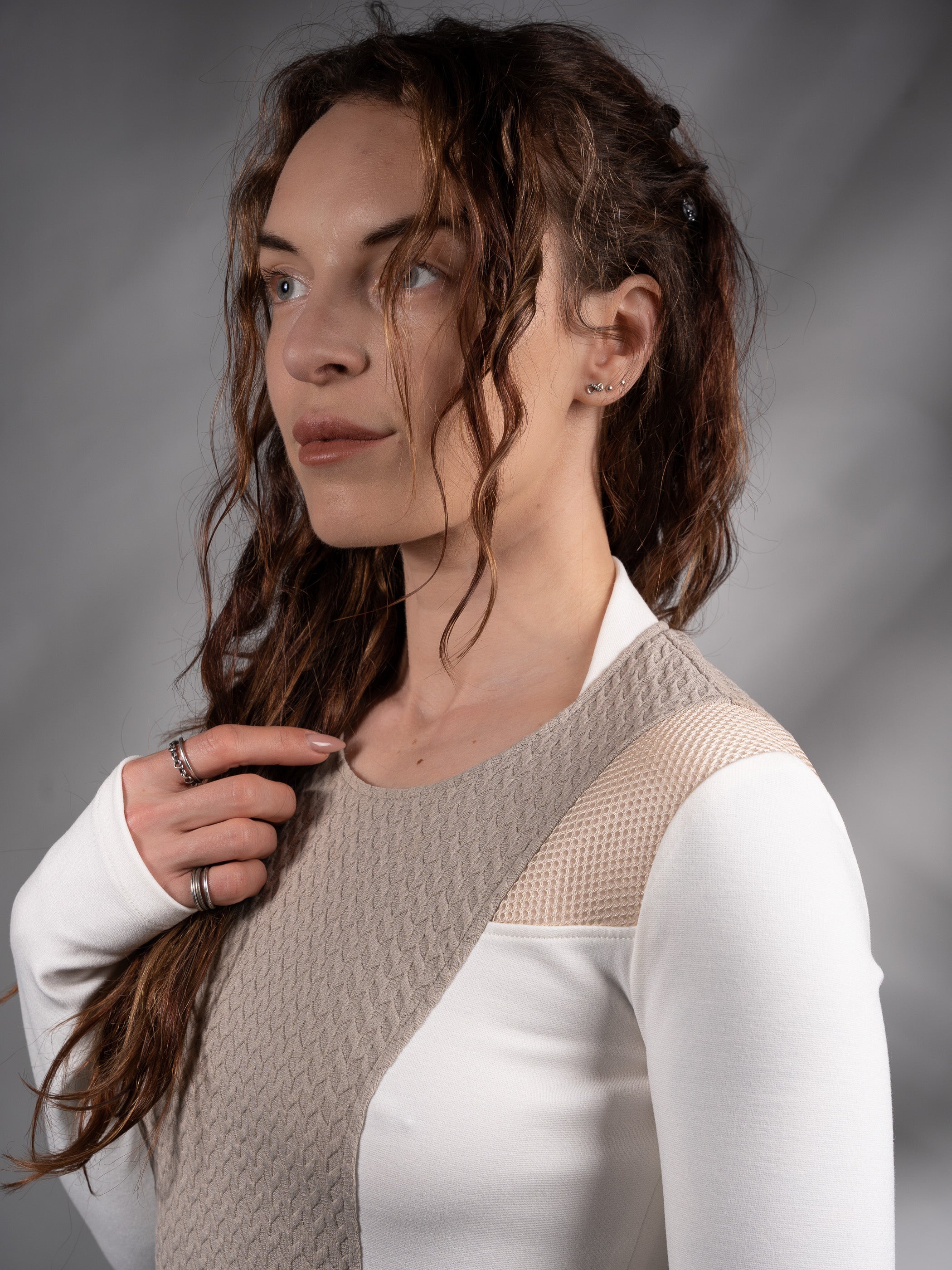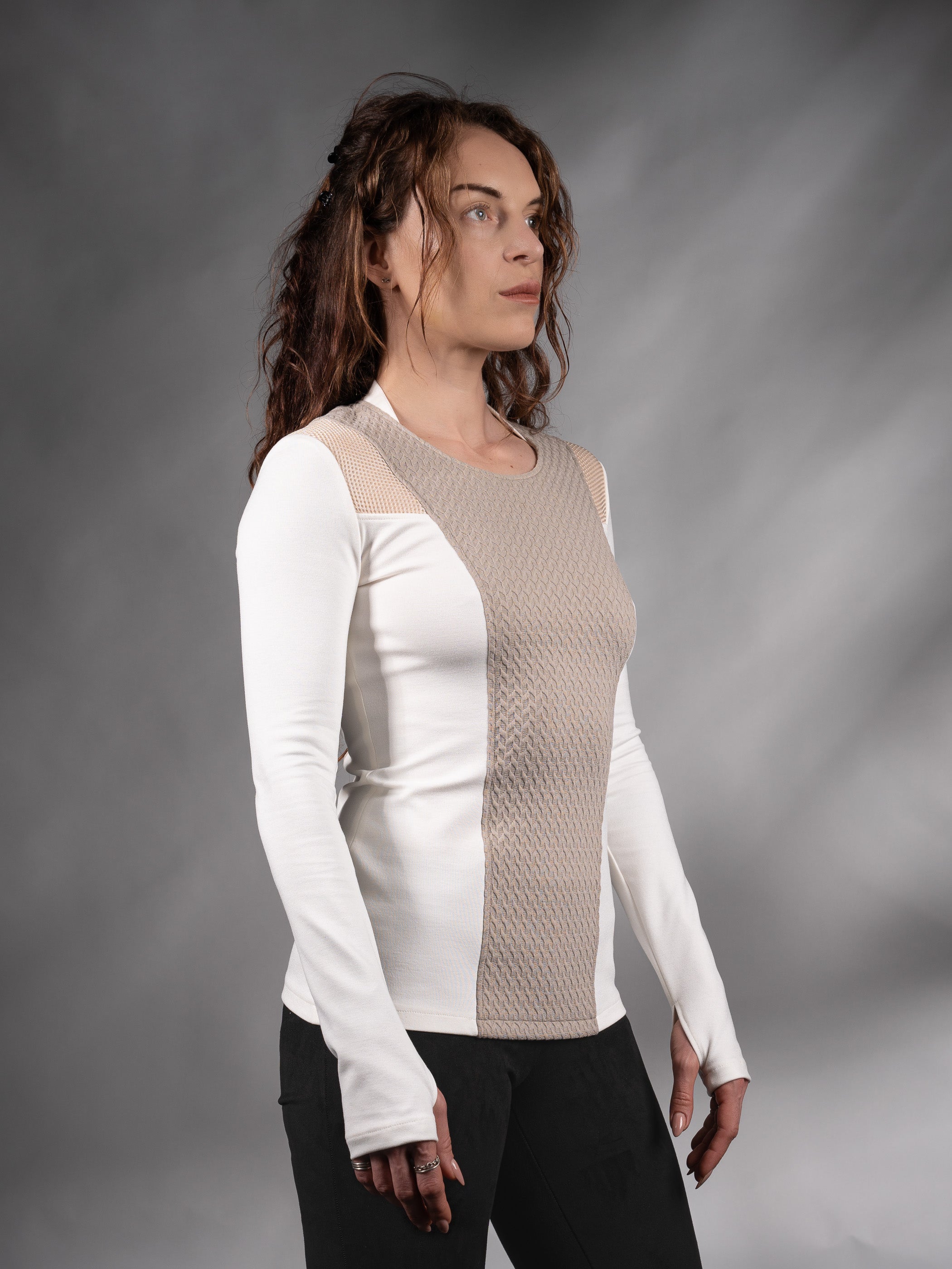 Cyberpunk sweater with thumbhole sleeves. The garment is made of breathable and soft viscose fabric combined with textured polyester fabrics ensuring comfort and a smooth feel against the skin.
