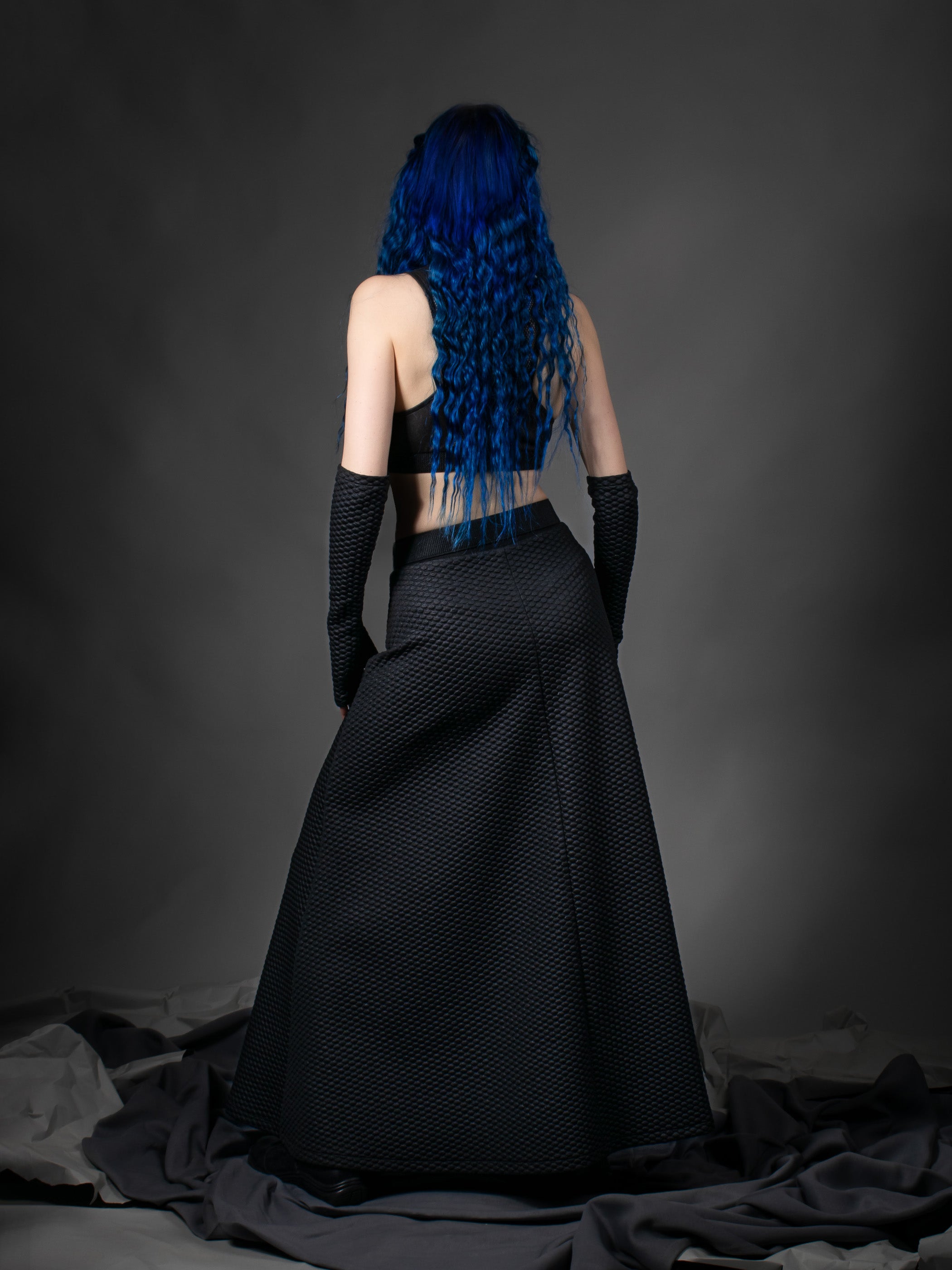 Black women's maxi skirt with hidden pockets. It is made of a polyester jersey. The skirt has some stretch so it's comfortable for daily wear. The garment is sewn with Eloflex thread which minimizes the risk of seam breakdown on stretch fabrics. The skirt's belt fastens with a Fidlock magnetic buckle. Both, the inner belt and belt with the buckle are adjustable. The garment is easy to care for - cold machine wash, no tumble dry.
