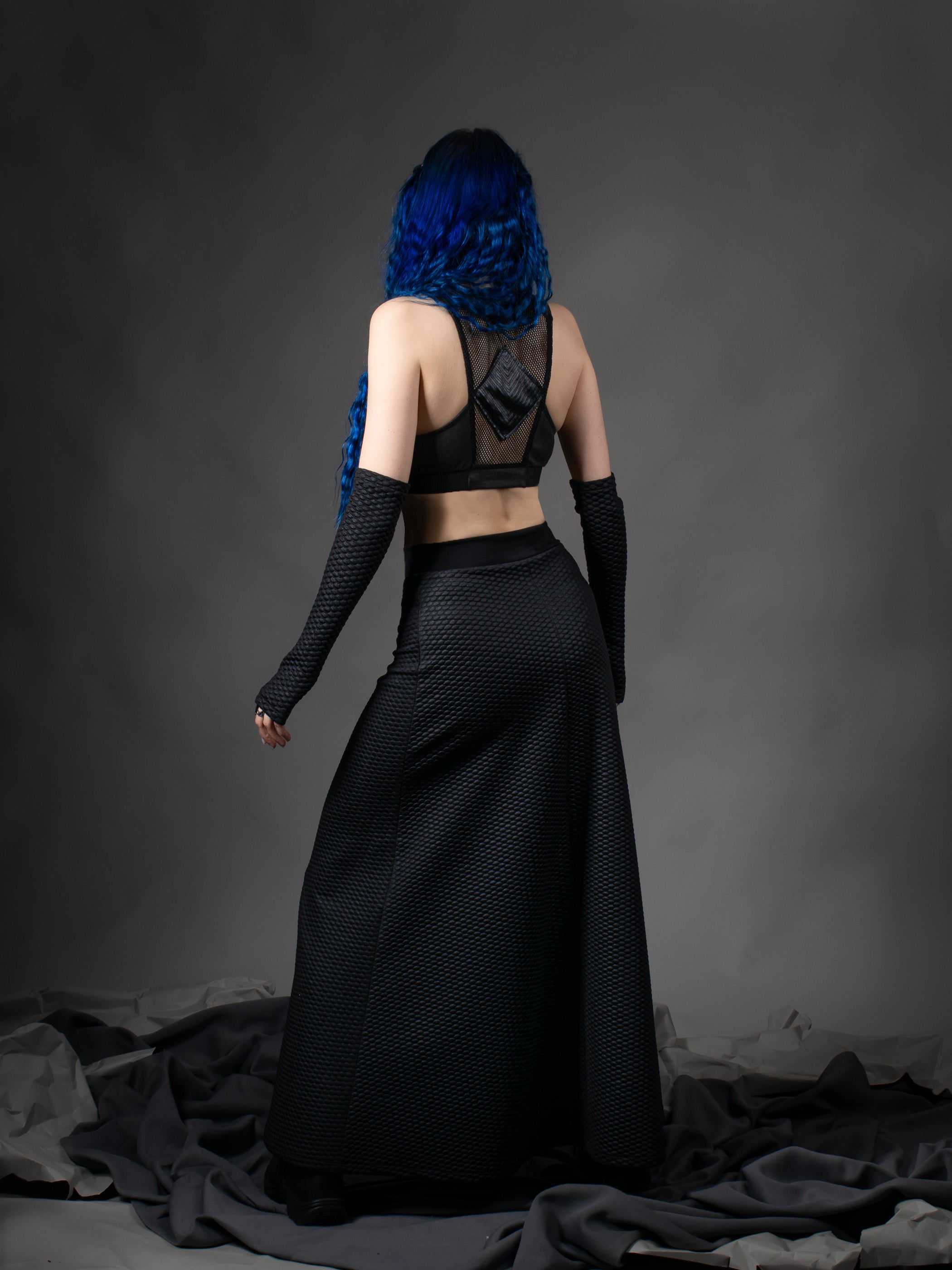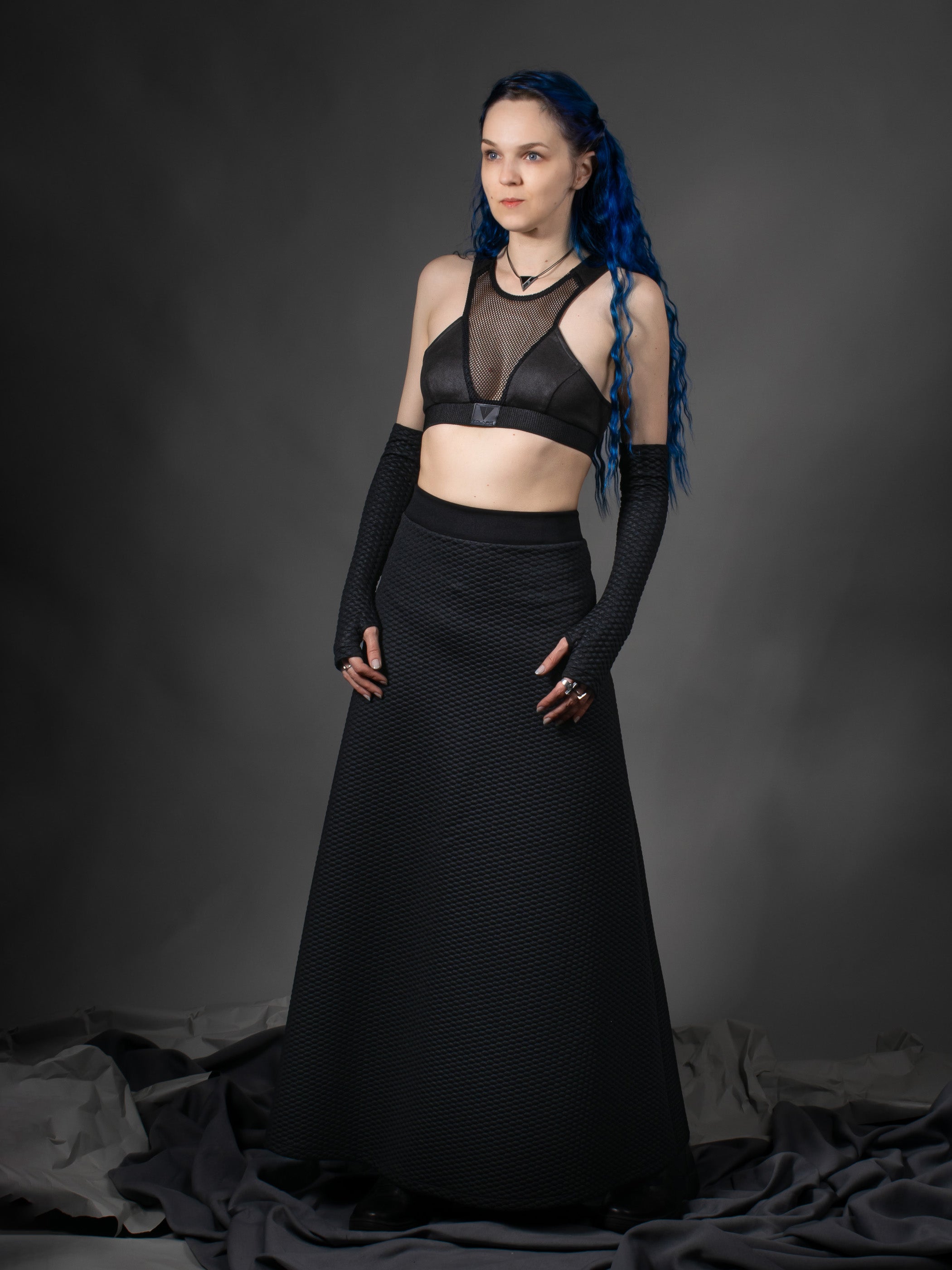Black maxi skirt made of textured polyester and viscose jerseys. The skirt is meant to be worn as a high waist. The garment is sewn with Eloflex thread which minimizes the risk of seam breakdown on stretch fabrics. The fabric is breathable and drapes well. It contains elastane which helps the fabric to keep its shape.