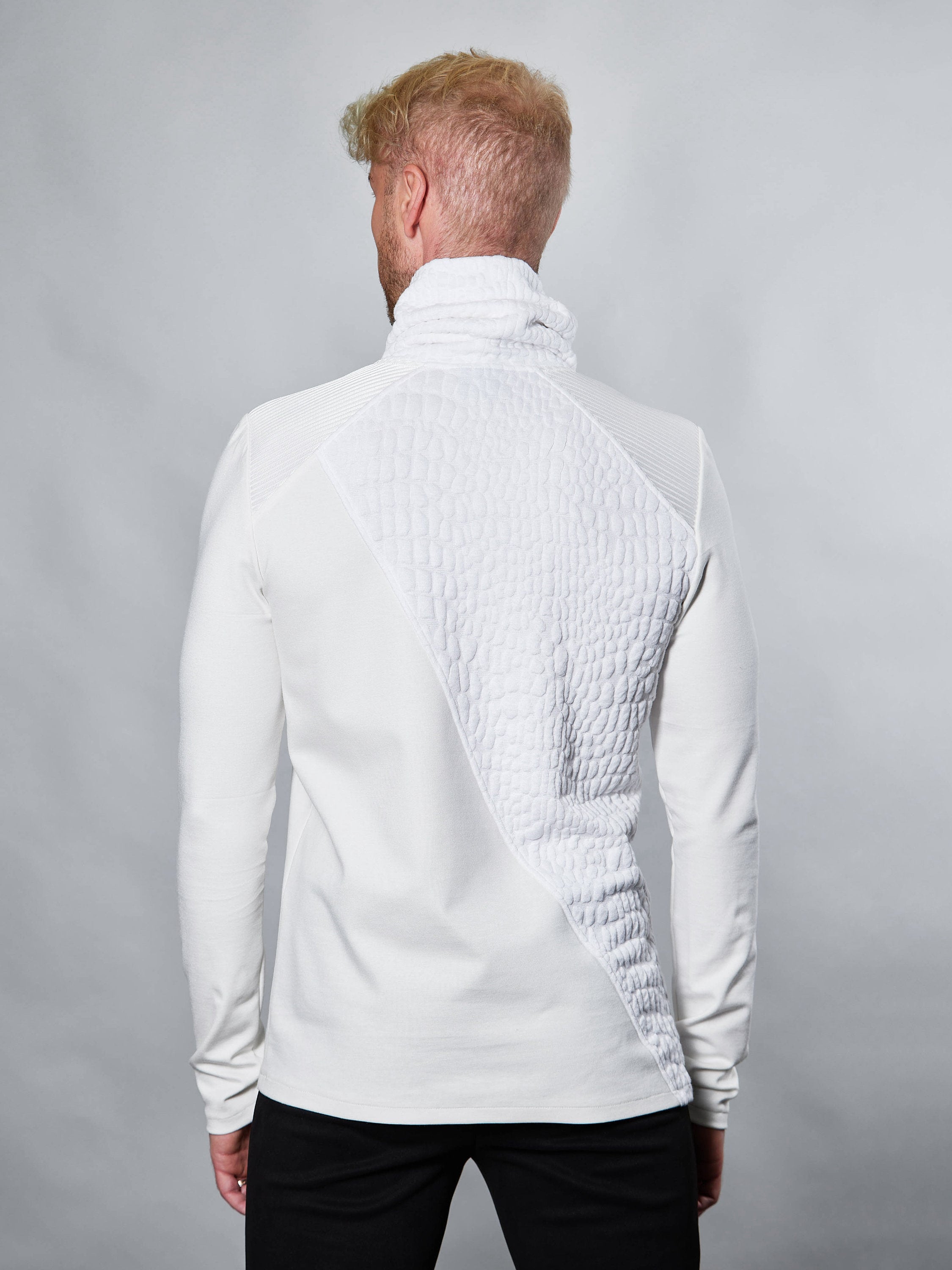 White cyberpunk sweater with high collar, asymmetrical cut. The fabric is stretchy, ensuring a flexible and comfortable fit. The Turtleneck collar is about 20 cm /~8in high. You can pull it up for extra warmth or protection.